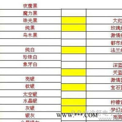 | 顏色 | 純黑,珠光黑,純白,珍珠白,亮銀,鈦銀,金屬銀灰,大紅,深藍,天藍,亮黃,香餅金 |