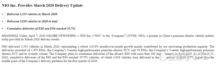 4月7日,蔚來汽車發(fā)布3月交付數(shù)據(jù)報告。報告顯示,蔚來汽車2020年3月共交付1533輛汽車,交付量環(huán)比增長116.8%。截至2020年3月31日,蔚來ES6和ES8已累計交付35751輛,其中2020年第一季度共交付3838輛。
