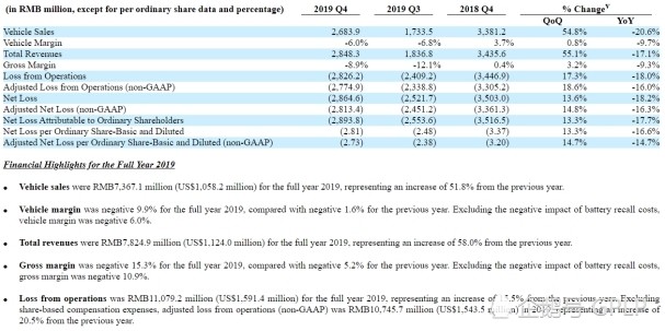 (蔚來汽車2019年第四季度和全年財務(wù)業(yè)績公告截圖)