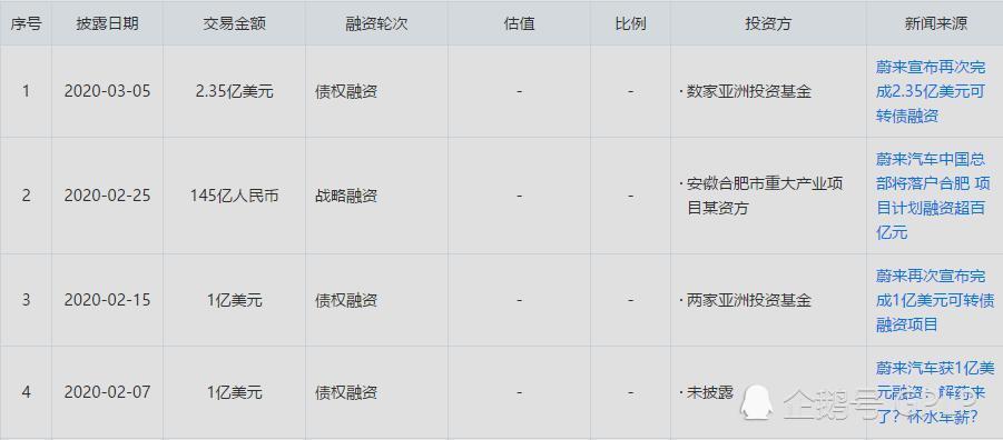 基于產(chǎn)品銷售方面的持續(xù)虧損,蔚來汽車的資金流也正面臨巨大壓力。公開資料顯示,2020年2月-3月短短一個月時間,蔚來汽車已進(jìn)行過3次債權(quán)融資,累計金額高達(dá)4.35億美元。值得一提的是,蔚來汽車在完成最新一輪債權(quán)融資的前十天,才剛完成一筆金額高達(dá)145億元的戰(zhàn)略融資。